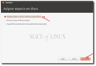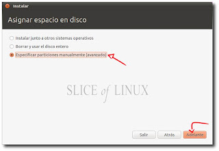 3. Especificar particiones manualmente (avanzado). Esta opción es la más recomendable si queremos sacar el máximo rendimiento a Ubuntu y también permite instalarlo junto a Windows XP, Vista o Windows 7.