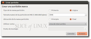 La siguiente partición que vamos a definir es el área de intercambio (swap) que se utilizará cuando no tengamos suficiente memoria RAM para mantener todas las aplicaciones en memoria o cuando hibernemos el sistema. Sobre el tamaño de esta partición hay muchas discusiones pero según las notas de la versión de Ubuntu 10.10 debe tener al menos el mismo tamaño que la memoria RAM que tengamos. Por ejemplo, si tenemos 2 GB de RAM, dejamos 2 GB para esta partición. El tipo tampoco importa en este caso pudiendo ser primaria o lógica. Sin embargo, el sistema de archivos será área de intercambio.