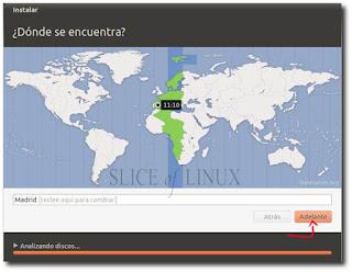 Por eso en la siguiente pantalla en la que debemos indicar dónde nos encontramos para establecer la zona horaria, podemos ver en la parte inferior la barra que indica el progreso de la instalación del sistema. Por defecto, Ubuntu detecta nuestra región aunque nosotros pero podemos cambiarla si no es correcta. Después hacemos clic en Adelante.