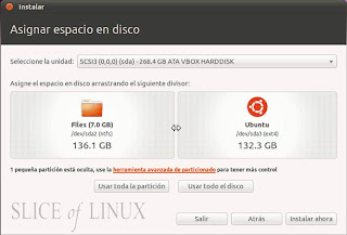 Ahora para particionar el disco duro, hay tres posibilidades que nos brinda el instalador de Ubuntu: