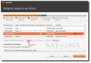 Ya tenemos nuestra primera partición para Ubuntu 10.10 y vamos a por la siguiente. Seleccionamos el espacio libre y hacemos clic en Añadir…