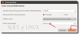 - Partición home (/home): en ella estarán los directorios y datos de los usuarios (documentos, imágenes, música, etc.). Así si cambiamos de distribución o actualizamos a otra nueva, por ejemplo Ubuntu 11.04, no tendremos que preocuparnos de nuestros datos porque se encuentran en una partición distinta.