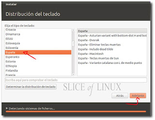A continuación seleccionamos la distribución de nuestro teclado. Ubuntu nos sugiere España que es la correcta y hacemos clic en Adelante.